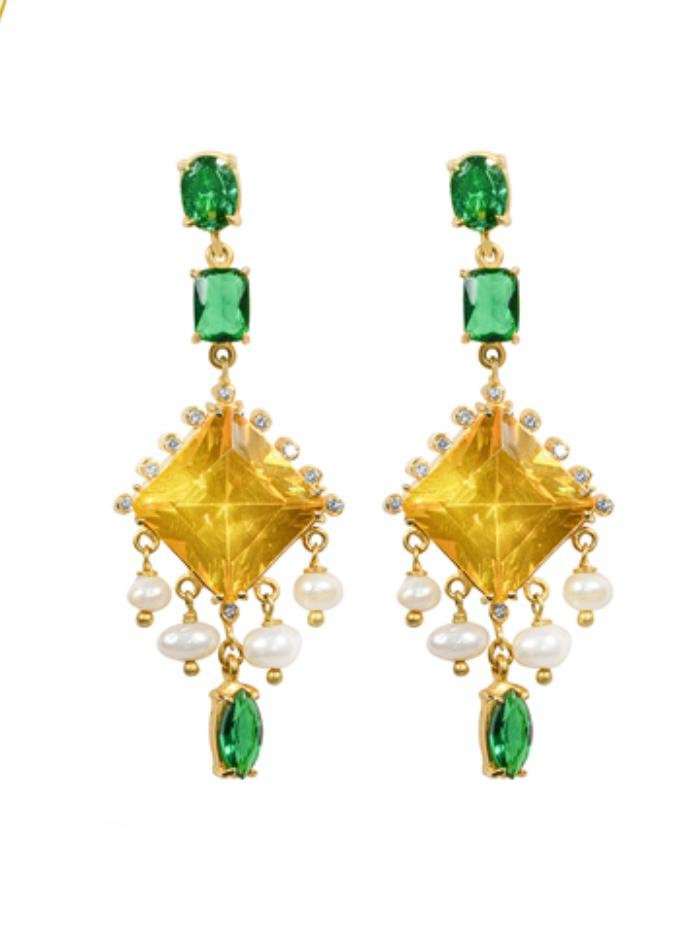 A unique design silver 925 k earrings " gold plated " with the exquisite gemstones of citrine, emerald , and pearl