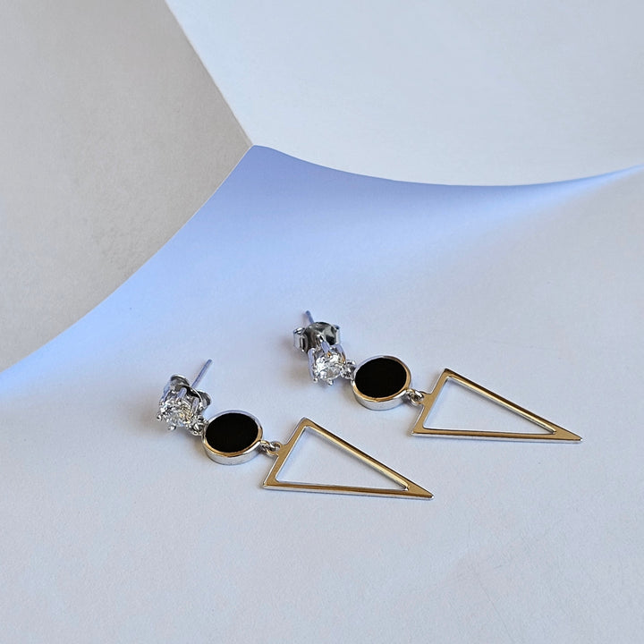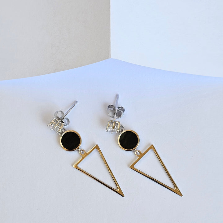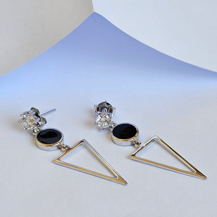 A contemporary triangle shape earrings. Sterling silver 925 k with an exquisite onyx stone that is believed to reduce mental tension and absorb bad energy to support mental well-being