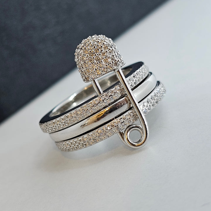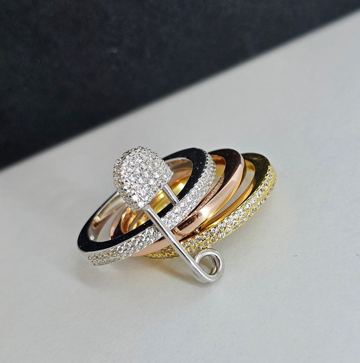 A very trendy and elegant design for triple hoop safety pin ring. Sterling silver 925 k with enormous magnificent zircone stones. 3 colour tones ( silver. Gold. And rose gold ).